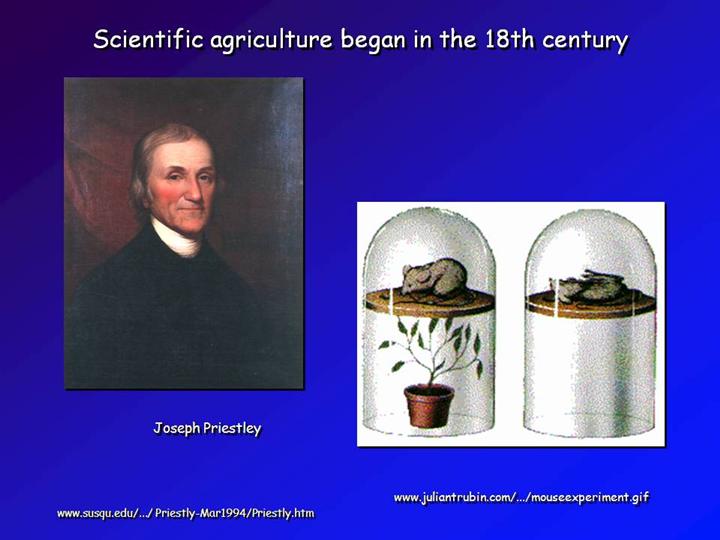At roughly the same time that Malthus was composing his gloomy prediction, modern science began to enter agriculture. In the early 1770s, Joseph Priestly figured out that plants emit oxygen by keeping a mouse alive in a sealed chamber with a mint plant. This was followed in rapid succession by the definition of the other minimal chemical requirements for plant growth, laying the groundwork for the development of chemical fertilizers.
