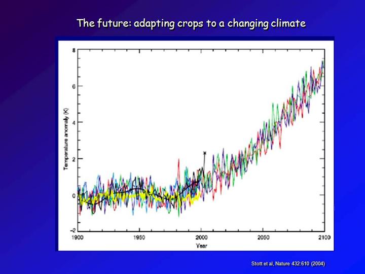 Here’s what this means for changing global temperatures, shown with respect to the average temperature in 1900. Black lines are observed temperatures, smoothed and unsmoothed. Red, blue and green lines are Hadley Centre simulations with natural and anthropogenic forcing. Yellow is natural only. The asterisk is the 2003 European heat wave of 2003. No matter what projections you use, no matter how rapidly we bring our greenhouse gas emissions under control, such summers will become more frequent in the coming decades and will be the typical summer in just a few decades. But our major crops were sculpted by people over tens of thousands of years in this moderate temperature range.