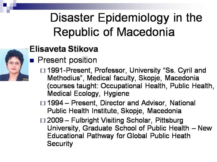 Previous experience: 2000 - 2002 - Director, National Public Health Institute (Republic Institute for Health Protection), 1998 - 2000 - Deputy-Director, Health Center “Skopje”, 1994 - 1998 - Director, National Public Health Institute (Republic Institute for Health Protection), 1983 - 1994 - Chief of the Department for planning and organization, Institute for Occupational Health, 1980 - 1982 - Industrial physician, Institute for Occupational Health. Other relevant positions: 2007 - Visiting Professor, Erasmus Mundus Europubhealth Master Studies, University of Sheffield, Sheffield, UK, 2007 - Visiting professor, Erasmus Mundus Europubhealth Master Studies, University of Krakow, Poland, 2006 - NATO Partner Country Co-director, Advanced Study Institute, Science for Peace and Security Program, 2004 - Study visit, Braun School of Public Health, Jerusalem, Israel 2003 - Study visit, Bordeaux and Bilbao, Preparation of New Curricula in the Field of Environmental and Occupational Health, 2003 - Study visit, Stanford University, USA, Environmental and Occupational Health Services, Risk assessment, 2002 - Professor, Medical Faculty, Courses: Environmental and Occupational health; Occupational Health 2002 - Professor, School of Dentistry, Course: Medical Ecology, 2000 - Professor, School for Education, Courses: Preschool Hygiene; School Hygiene, 1997 - Associate Professor, Medical faculty, Course: Hygiene and Occupational Health, 1990 - Assistant Professor, Medical faculty, Course: Hygiene, Social Medicine and Occupational Health, 1985 - Assistant, Medical Faculty, Topic: Hygiene, Social Medicine and Occupational Health. Specialization: (i) main field Occupational Health (ii) other fields Risk Analysis Public Health Accreditation criteria, quality assurance, ISO/IEC standards(ISO 9000, ISO 45000 and ISO17025), Global Survey - Disease surveillance, Detection and Response page 2 of CV Epidemiology, Medical Statistics, Health Indicators and Data Presentation System Food Safety and Control, Codex Alimentarius and HACCP (iii) current research interest Chemical, biological and radiological risk assessment; rapid detection of CBR agents, susceptibility of population; biological monitoring; health impact assessment; public health preparedness and response; bioterrorism; pandemic flu; climate change; food safety and control. |