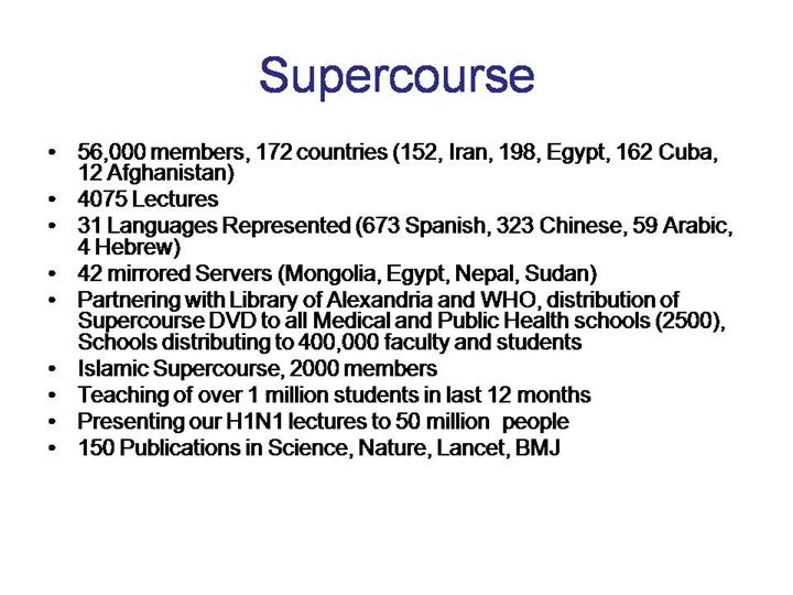 The Supercourse in the past few years has exploded with close to 60 thousand faculty. These faculty have contributed over 4000 lectures on global health and prevention. Volunteers have translated lectures into 31 languages. We have over 500 lectures translated in Spanish, and 34 in Arabic, for example. We have been distributing the Super via several means to bridge the digital divide. One way has been to create 42 mirrored servers around the world. There is so much server space, even in developing countries, the mirrored servers are shared virtually for free. The Library of Alexandria and the World Health organization have distributed a BA supercourse DVD to all medical, public health, and nursing schools, as well as all medical libraries. WHO, the Library and us are asking the schools to copy the DVD for all faculty and students. This has been quite successful with over 400,000 faculty and students receiving a DVD. We work very closely with the Library of Alexandria to build an OIC supercourse. There has been considerable interest in our lectures as they have taught over a million students in 12 months. Our H1N1 Just in Time lecture was seen be over 50 million people primarily because CCTV, the major Chinese Television show picked it up. Our Just in Time lectures typically are viewed as much more credible then local news and government. We believe that it is essential to publish, and we have been quite successful in the leading journals.