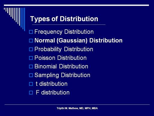 There are several types of distribution: frequency distribution, normal distribution, probability and sampling distributions. This lecture will focus on normal distribution. |