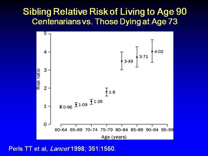 102 centenarians (10 men, 92 women) in eastern Massachusetts, 77 controls (28 men, 49 women) born in 1896 but died age 73 centenarians had 456 sibs (233 men, 223 women), controls had 240 sibs (121 men, 119 women) RR higher after age 70 For any age after 65, siblings of centenarians had a 42·4% lower hazard of death (95% CI 0·334–0·538, p<0·0005). |