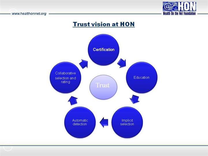 HON based its concept of Trust on traditional means of assessing knowledge. Personal reference from the origin/author basic, good if we already know who she/he is citations from or to this author may also be trusted larger recognition by institutions or sector-specific peer review adds weight. The Honcode reaches through all 4 levels: it is a global single code of quality applicable to all these relations.