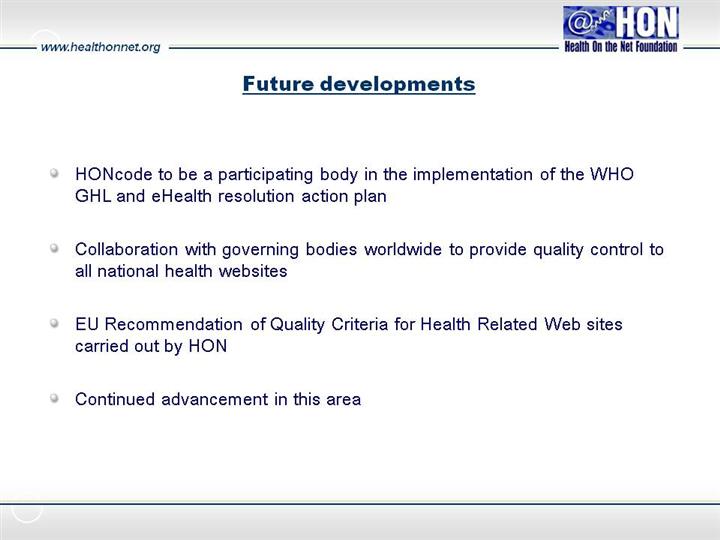 HON has continuously worked towards the goal of quality information for over a decade and in doing so, has earned the trust of high level partners in the government and the public. Based on the ongoing collaboration with France, HON could replicate this with other countries world wide.