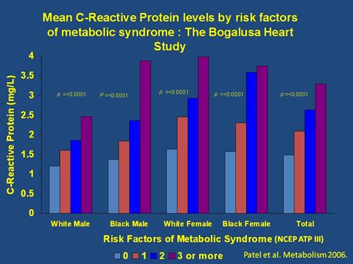 CRP levels increasing with increased numbers of risk factors. Note greater levels in blacks and females