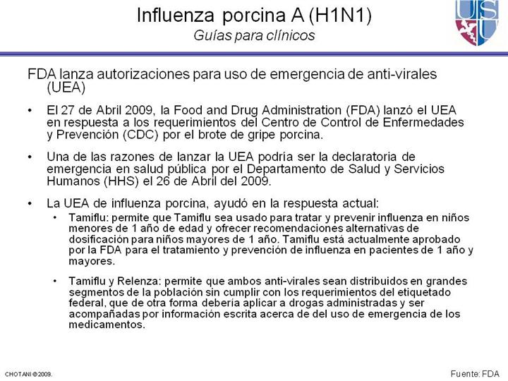 FDA autoriza uso de emergencia de medicamentos anti virales, pruebas diagnósticas, en respuesta al brote de la griupe porcina en humanos (Comunicado de noticias), . Rockville, MD: U.S. Food and Drug Administration. 27 de Abril 2009. http://www.fda.gov/bbs/topics/NEWS/2009/NEW02002.html. Acceso 28 Abril 2009.