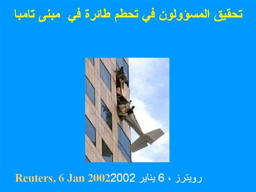في بداية عام 2002 ، كان هناك حادث تحطم الطائرة في مبنى في مدينة تامبا بولاية فلوريدا. حطم طالب طيران يبلغ من العمر15 عاما طائرة صغيرة اخذها من مطار قريب. هذا الحدث اتضح أنه هجوما انتحاريا ، مع ملاحظة مرفقه مع الانتحاري(15 عاما) الذي أعطى تفاصيل بأن ما فعله مستوحى من هجمات 11 سبتمبر على مركز التجارة العالمي والبنتاغون. |
