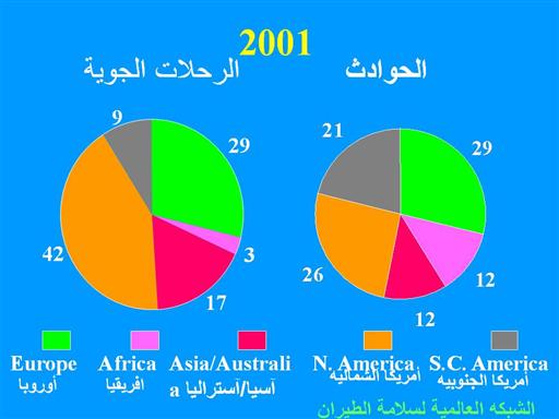 معظم الحوادث التي وقعت في عام 2001 كانت في أوروبا وأمريكا الشمالية ، مما يعكس وجود عدد كبير من الرحلات الجوية في هذه القارات. عندما ينظر اليها فيما يتعلق بتوزيع جميع الرحلات الجوية ، جنوب أفريقيا وأمريكا الوسطى كانتا نسبيا أكثر حوادث في عام 2001