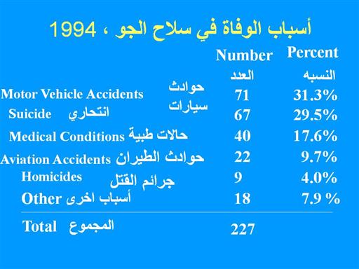 سلط الضوء في هذا الرسم على المخاطر المتصلة بالطيران والتي تصور الوفيات في سلاح الجو الأميركي. في هذا الفرع من الجيش الامريكي ، الرحلة الجوية هي الوسيلة الأساسية للعملية. رغم ذلك الوفيات الناجمة عن حوادث الطيران ، ليست على رأس قائمة أسباب الوفاة. انها لاتمثل سوى 10 ٪ من جميع الوفيات التي لوحظت في سلاح الجو. وعموما ، فإن المخاطر الناجمة عن السفر جوا ينظر إليها على انها أعلى مما هي عليه في الواقع. Sourcesالمصدر : US Air Forceالقوه الجويه الامريكيه AL/AOP Powell KE, Fingerhut LA, Branche CM, Perrotta DM. Deaths due to Injury in the Militaryالوفيات الناجمة عن الإصابات في الجيش. American Journal of Preventive Medicineالمجلة الأمريكية للطب الوقائي 2000; 18(3S):26-32. |