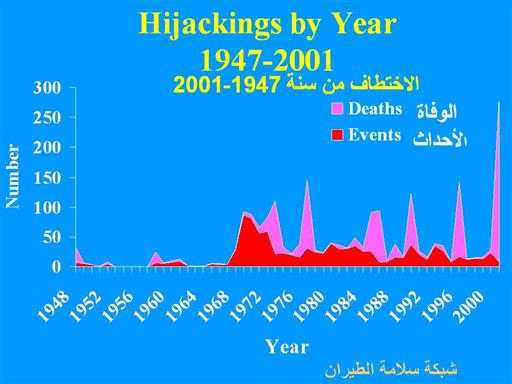 قد اختلف عددعمليات الاختطاف الملحوظه مع مرور الوقت. وقعت فترة الذروة لعمليات الخطف بين 1968-1973. حيث اجراءات الفحصوص الدرامية نفذت في ذلك الوقت ، و انخفض تواتر الاختطاف ، وإن لم يتم القضاء عليها. في المتوسط ، في الفترة من 1972-2001 ، كان هناك نحو 22 حدثا في السنة. الوفيات الناتجة عن عمليات الخطف واضحة بشكل خاص في الرسم البياني. ويلاحظ وجود قمم للسنوات 1973 ، 1977 ، 1985-86 ، 1990 ، 1996 ، و 2001. هذه الوفيات مرتبطة أساسا بحدث رئيسي واحد حدث في تلك السنوات (2001 جانبا). ويبدو ان هناك أيضا وجود نمط لهذه الأحداث الكبرى ، واحدة كل خمس سنوات أو نحو ذلك. ما هي العوامل التي يمكن أن تسهم في هذه الملاحظة؟ |