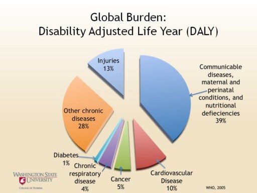 Approximately 50% of the burden of disease worldwide is a result of chronic conditions as compared to 39% by communicable diseases and 13% from injury.
