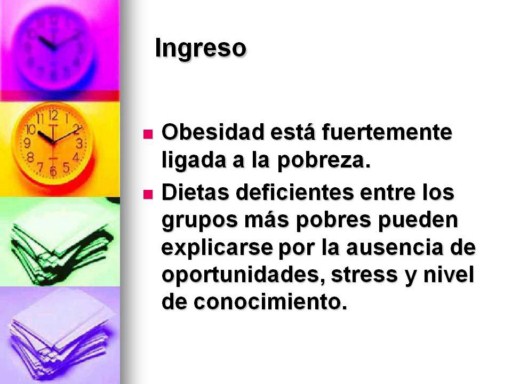 El ingreso tiene efectos directos e indirectos sobre la salud, ya que afecta las condiciones de vivienda, dieta de la familia. El efecto indirecto del ingreso en la elección de la dieta y de los hábitos dietéticos, ha sido ampliamente investigada; personas de viviendas de bajo ingreso tienden a comer menos fruta, vegetales y alimentos ricos en fibra y más azúcar que las personas de viviendas de mayor ingreso. |