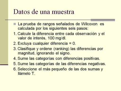 Este valor de T se compara con las tablas de valores críticos de la prueba de rangos señalados de Wilcoxon. Leemos la tabla en el renglón correspondiente a las diferencias no cero. Cada renglón tiene diferentes rangos de valores correspondientes a diferentes valores de p. Si el valor de T está fuera del rango, o exactamente igual a uno de los valores, el valor de p de la prueba, es menor que el indicado en la columna. Si el valor de T está dentro del rango, el valor de p de la prueba es mayor que el indicado por la columna.