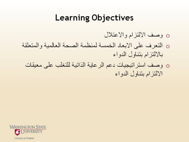 في هذا العرض التالي ستكون قادر على : وصف الالتزام والاعتلال التعرف على الابعاد الخمسة لمنظمة الصحة العالمية والمتعلقة بالالتزام بتناول الدواء وصف استراتيجيات دعم الرعاية الذاتية للتغلب على معيقات الالتزام بتناول الدواء