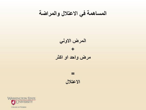 الاعتلال“المراضة“ : عندما يتصاحب المرض الاولي بمرض او حالة مرضية او مرض مزمن او غير معدي مثل السكري ”مرض“, ارتفاع ضغط الدم“ حالة“, ومع بعضها البعض تشكل الاعتلال او المراضة