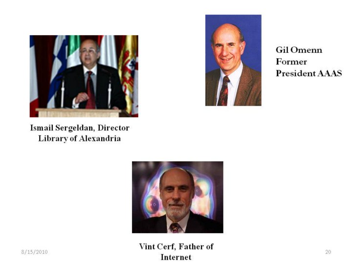 The Outside leaders of the Supercourse include Ismail Sergeldan, Ph.D., the Director of the Library of Alexandria, Gil Omenn, M.D., former president of the American Association for the Advancement of Science, and Vint Cerf, the Father of the Internet. These 3 have been collaborating with the US Supercourse Team of Drs. LaPorte, Sauer and Linkov. |