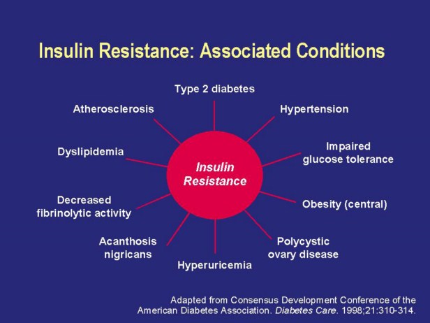 In addition to type 2 diabetes, insulin resistance is associated with the development of a broad spectrum of clinical conditions. These include hypertension, atherosclerosis, dyslipidemia, decreased fibrinolytic activity, impaired glucose tolerance, acanthosis nigricans, hyperuricemia, polycystic ovary disease, and obesity.