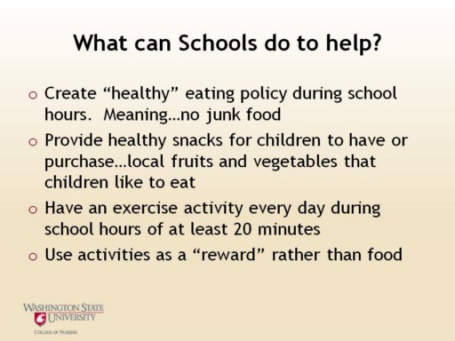 When children are in school, they are dependant, many times, on the school to help with meals. Schools have a large part in helping children to learn how to eat healthy. There are several simple things that schools can do to help children to be healthier and more active. Teachers and school administrators can help students learn what is a good diet and what is a bad diet. To help students learn what ‘healthy means”.