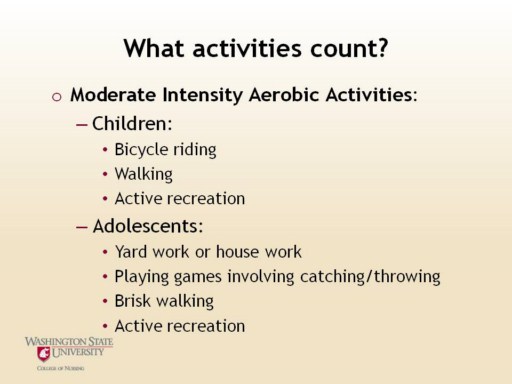 -Important to focus on age appropriate and fun activities. -Depending upon the setting or part of the world, children may already be participating in several unstructured activities daily (gardening, digging, running, dancing, etc). http://www.cdc.gov/physicalactivity/everyone/guidelines/what_counts.html