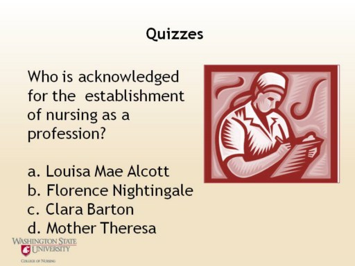 Quizzes are used to test the learning of content. They can also be used during class to see how well the class is engaged in the lecture, or to see if students are having questions about the material being presented. Using quizzes in a lecture can also help you find out if you need to review difficult content again or if you can move on with the next subject. They can also be for fun to break-up a long class session. The answer above is .B! |