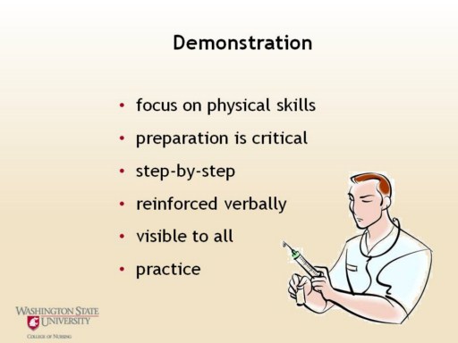 If the demonstration is performed correctly, it can be a very effective in showing what happens; or, the educator may have students demonstrate the correct procedure to the class. Students tend to pay closer attention to classmates, and performing the demonstration gives students hands-on experience to reinforce concepts. It is very effective for skills learning.