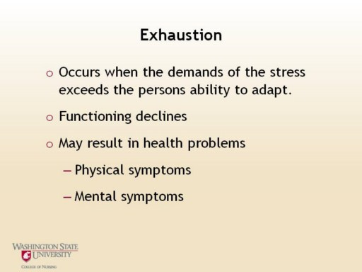 Exhaustion occurs when resources are diminished and the body can no longer compensate for the stressor (Copstead & Banasik, 2010). |