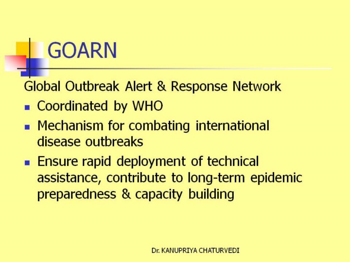 The Global Outbreak Alert and Response Network (GOARN) is a technical collaboration of existing institutions and networks who pool human and technical resources for the rapid identification, confirmation and response to outbreaks of international importance. The Network provides an operational framework to link this expertise and skill to keep the international community constantly alert to the threat of outbreaks and ready to respond. The Global Outbreak Alert and Response Network contributes towards global health security by: combating the international spread of outbreaks ensuring that appropriate technical assistance reaches affected states rapidly contributing to long-term epidemic preparedness and capacity building.