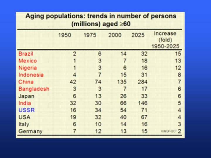 As part of the epidemiologic transition is the rapid increase in Aging populations world wide. |