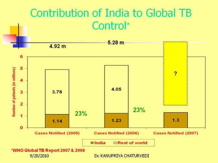 On a national scale, the high burden of TB in India is illustrated by the estimate that TB accounts for 17.6% of deaths from communicable disease and for 3.5% of all causes of mortality (WHO, 2004). More than 80% of the burden of tuberculosis is due to premature death, as measured in terms of disability-adjusted life years (DALYs) lost . WHO estimated TB mortality in India as 276,000 (24/100,000 population) in 2008. With RNTCP implementation, there is 43% decline in death due to TB in India by 2008 is compared to 1990. It was estimated that the TB mortality was over 500,000 annually at the beginning of the revised national TB control program (RNTCP). Data from specific surveys, however, suggest that case fatality rates prior to RNTCP were generally greater than 25%. In RNTCP era, case fatality has remained less than 5% for new cases registered under the program.