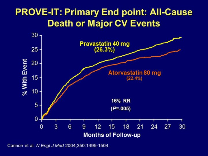 Kaplan-Meier estimates of the rates of the primary end-point (all-cause death, or major CV events) at two years were 26.3% in the pravastatin group and 22.4% in the atorvastatin group, reflecting a 16% reduction in the hazard ratio in favor of atorvastatin (p=0.005). The study thus identified the superiority of the more intensive atorvastatin regimen.