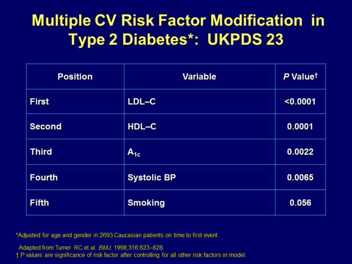 Key Point: Coronary artery disease (CAD) was significantly associated with increased concentrations of LDL-C, decreased concentrations of HDL-C, increased triglyceride concentration, hemoglobin A1C, systolic blood pressure, fasting plasma glucose concentration and a history of smoking. CAD is a major cause of mortality in patients with type 2 diabetes Patients without evidence of disease related to atheroma at diagnosis of type 2 diabetes had an increased standardized mortality ratio compared with the population of the United Kingdom The potentially modifiable risk factors for CAD were increased concentrations of LDL-C, decreased concentrations of HDL-C, increased triglyceride concentration, hemoglobin A1C, systolic blood pressure, fasting plasma glucose concentration and a history of smoking In other studies, obesity and central obesity, decreased physical activity and raised insulin concentrations provide an increased risk for cardiovascular disease. But in this trial, patients with type 2 diabetes, the authors found that none of these were major risk factors in this cohort of patients Reference Turner RC et al. Risk Factors for the coronary artery disease in non-insulin dependent diabetes mellitus: United Kingdom prospective diabetes study (UKPDS:23). BMJ. 1998;316:823-828. Go to the Part II of this lecture If you have any comments or questions, please send a message to super1@pitt.edu