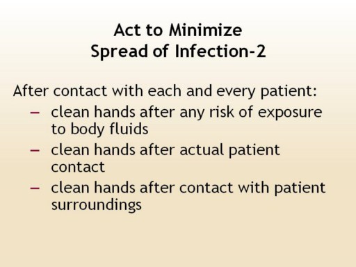 Students should wash hands after actual patient contact. All students should clean their hands after touching a patient and his or her immediate surroundings. This should be done using one of the methods available to the clinic or hospital immediately after the patient contact is over. This is because in busy environments there are many distractions and busy people tend to rush onto the next job or patient. Many people forget in the rush to wash their hands. Forgetting to wash hands can lead to the student getting an infection and increasing the chances of the microorganisms spreading throughout the environment. Saying goodbye to the patient by shaking a hand or touching a shoulder provides opportunities for micro-organisms to be transferred to the student and vice versa. Activities in addition to those mentioned above that involve direct physical contact include helping a patient to move around, to get washed or to give a massage, which are known routes for micro-organisms spreading to others. Students performing clinical examination such as taking pulse, blood pressure, chest auscultation and abdominal palpation are all opportunities for cross-infection.