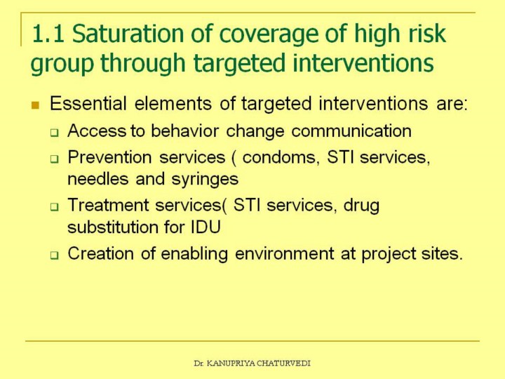 Prevention is the mainstay of the strategic response to HIV/AIDS in India as 99 percent population of the country is uninfected. The HIV prevalence pattern in the remaining one percent population largely determines the prevention and control strategy for the epidemic in the country. The HIV prevalence trend in the country shows disproportionately higher incidence of the infection among certain population groups. An analysis of Annual Sentinel Surveillance data (2003-2005) shows that female sex workers (FSWs), men-who- have-sex-with-men (MSM) and injecting drug users (IDUs) have disproportionately higher incidence of HIV infection. Whereas HIV prevalence in the general population is 0.88 percent, its prevalence among FSWs is 8.44%, IDUs 10.16%, MSM 8.74% and among the attendees of STD clinics it is 5.66%( see the table below). To gain control over HIV/AIDS spread in the country therefore effective interventions are needed for HRGs. Targeted Interventions for Prevention, Care and Treatment For the overall reduction in the epidemic, targeted interventions (TIs) are aimed to effect behaviour change through awareness raising among the high risk groups and clients of sex workers or bridge populations. These interventions are aimed to saturate three high risk groups with information on prevention; address clients of sex workers with safe sex interventions, and build awareness among the spouses of truckers and migrant workers, women aged 15 to 49 and children affected by HIV or vulnerable population groups. Apart from prevention of HIV infection, TIs facilitate prevention and treatment of sexually transmitted diseases as they increase the risk of HIV infection, and are linked to care, support and treatment services for HIV infected |