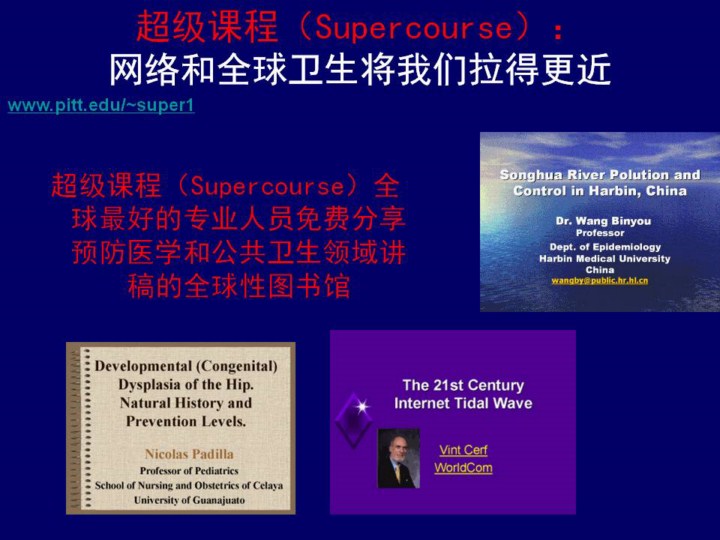 超级课程(Supercourse)目前拥有172个国家超过46,000位讲者的超过4,500篇讲稿。超级课程是一个对教学进行补充的范例,全球的教师在此分享他们最优秀的讲稿。越来越多的Supercourse讲稿贡献给全球卫生的研究。