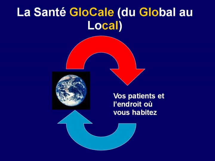 La santé en général est locale et mondiale; de ce fait, tous les médecins, les infirmières et les autres professionels de santé doivent se familiariser à la fois avec la santé locale et mondiale. |