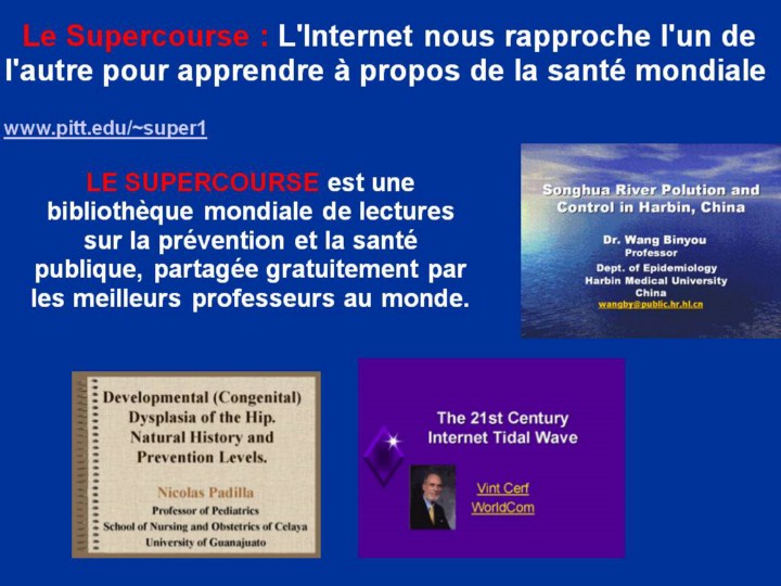 Le « Supercourse » www.pitt.edu/~super1 a actuellement plus de 4,650 conférences partagées par plus de 46 000 membres du corps professoral dans 172 pays.  Le « Supercourse » est un modèle de supplément d’enseignement, où les enseignants du monde partagent leurs meilleures conférences. Un nombre croissant de présentations du « Supercourse » est dédié au thème de recherche en santé mondiale.