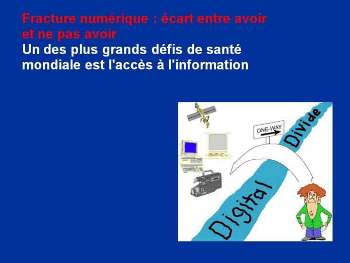 En plus des différentes maladies, nous affirmerons qu'un des plus grands défis à la santé mondiale est l'accès à l'information. Nous avons besoin de partager des informations dans le domaine de la recherche en santé mondiale à travers la fracture numérique.