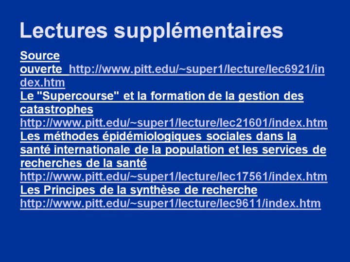 Veuillez visiter le projet global de Supercourse réseau de santé pour les conférences supplémentaires à Venez vous joindre à la Supercourse en visitant http://www.pitt.edu/~super1/assist/join.htm Open Source http://www.pitt.edu/~super1/lecture/lec6921/index.htm Supercourse et Disaster Management Training http://www.pitt.edu/~super1/lecture/lec21601/index.htm Social méthodes épidémiologiques en santé de la Population International et Health Services Research http://www.pitt.edu/~super1/lecture/lec17561/index.htm principes de recherche synthèse http://www.Pitt.edu/~Super1/lecture/lec9611/index.htm