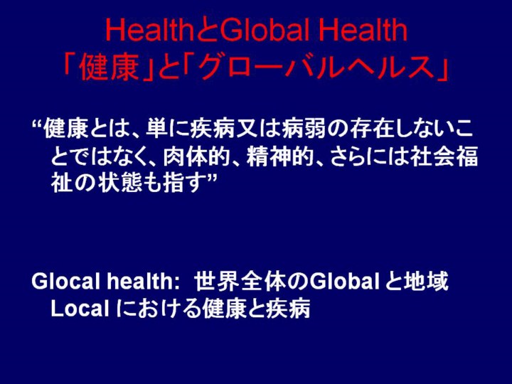 地球規模での健康問題を改善するためには、世界global と地域local を合わせた“GloCal” な発想が必要です。私たちの目の前にいる患者さんは、その身の回りの環境だけでなく、地域社会、国、さらには世界に影響を受けているのです。患者さん個人の全体と、世界全体を考えねばなりません。