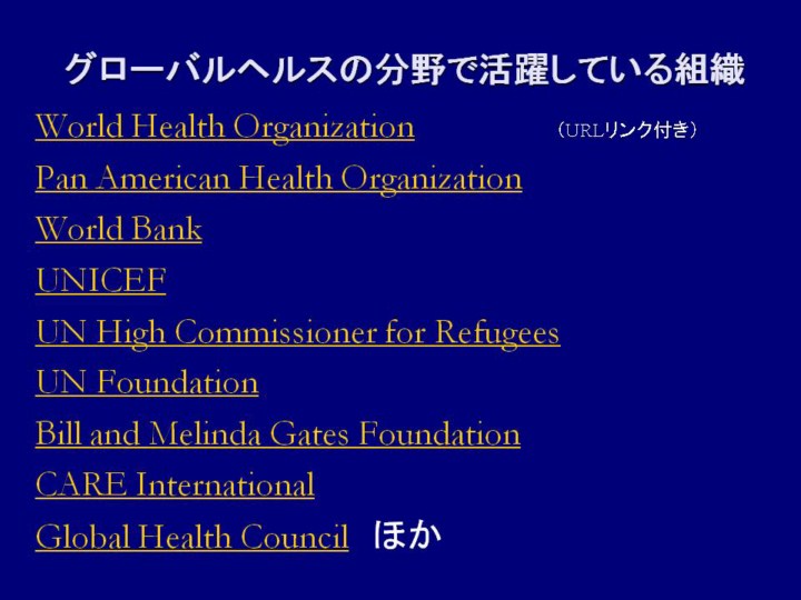 これまで述べてきたように、世界で健康問題に立ち向かう重要な国際機関・基金・NGOなどは多数あります。 Pan American Health Organization UN High Commissioner for Refugees |