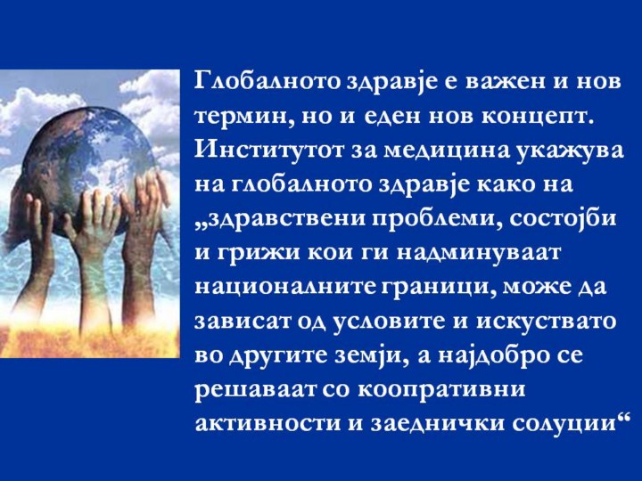 Меѓутоа, тоа не се само проблеми кои ги минуваат границите или се заеднички за повеќе земји од светот; решенијата за тие проблеми исто така може да ги минуваат границите и меѓусебно да се споделуваат, независно од степенот на развој на засегнатите земји. Сите земји може да учат од другите земји и може да ги споделуваат своите искуства и информации. Дефиницијата за глобално здравје го осветлува проблемот од две страни: споделување на проблемите и споделување на решенијата. Овој нов пристап е многу значаен за науката за глобалното здравје со оглед дека глобалното здравје се слика како патека за споделување.
