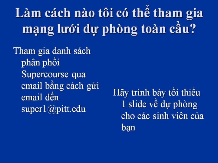Tham gia danh s�ch ph�n phối Supercourse qua email bằng c�ch gửi email đến super1@pitt.edu H�y tr�nh b�y tối thiểu 1 slide về dự ph�ng cho c�c sinh vi�n của bạn |