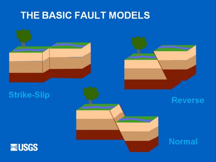 Three types of faults Form depending on type of plate motion and complex reaction of earth’s lithospheric blocks Strike-slip Normal Thrust