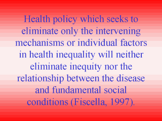 | Fundamental social causes of disease directly enhance or hinder access to resources such as “money, knowledge, power, prestige”, as well as interpersonal resources like social support, social cohesion and social capital. Controlling access to resources which affect the “risk of being at risk” for health outcomes results in inequity of health status (Link, 1995). |