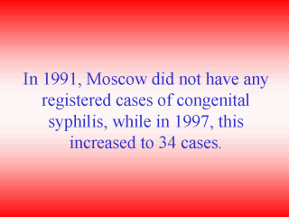 | Children have been affected as well – in 1991, there were 6 cases of syphilis among children, while in 1997, 101 new cases were registered. More than 55% of children, aged 12-14, who contracted syphilis, did so in sexual encounters. Other sexually transmitted diseases have also increased four-fold during this period. |