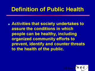 Definitions of health have evolved over the course of this century from the simple absence of diagnosable disease, to a state of well-being to the inclusion of the capacity to live and work in community. Public health moves the concept of health into the realm of a shared concern, whatever definition of health is understood. While public health can be and is pursued by all sectors of the community in some way, the definition implies that there is an organized and explicit commitment to bring about the desired conditions. Such a commitment is generally acted upon at least in part through governmental action. |