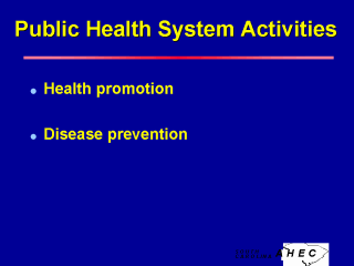Health promotion: - Any intervention that seeks to eliminate or reduce exposure to harmful factors by modifying human behaviors - Any combination of health education and related organizational, political and economic interventions designed to facilitate behavioral and environmental adaptations that will improve or protect health. Disease prevention: - Any intervention that seeks to reduce or eliminate diagnosable conditions; - May be applied at the individual level, as in immunization, or the community level, as in the chlorination of the water supply. |