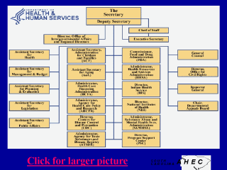 This chart is taken directly from the DHHS web site . Descriptions of each agency, and more detailed organizational charts are also accessible through that site. Note: since this chart was prepared, the Congress has reauthorized and renamed the AHCPR the Agency for Healthcare Research and Quality (AHRQ).