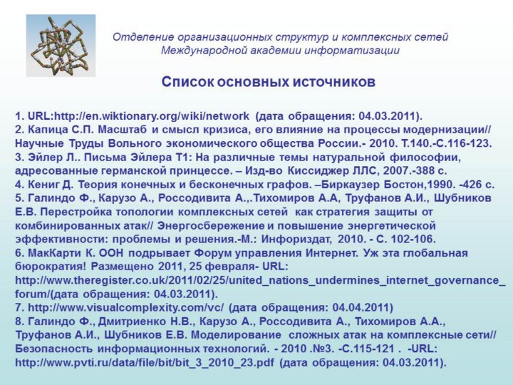 6.МакКарти К. ООН подрывает Форум управления Интернет. Уж эта глобальная бюрократия! Размещено 2011, 25 февраля- URL: http://www.theregister.co.uk/2011/02/25/united_nations_ undermines_internet_governance_forum/ (дата обращения: 04.03.2011). 7. http://www.visualcomplexity.com/vc/ (дата обращения: 04.04.2011) 8. Галиндо Ф., Дмитриенко Н.В., Карузо А., Россодивита А., Тихомиров А.А., Труфанов А.И., Шубников Е.В. Моделирование сложных атак на комплексные сети// Безопасность информационных технологий. - 2010 .№3. -C.115-121 . -URL: http://www.pvti.ru/data/file/bit/bit_3_2010_23.pdf (дата обращения: 04.03.2011).