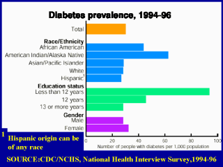 Key points: - Number of people with diabetes by race/ethnicity, education, gender - Period prevalence - Differences among subgroups |